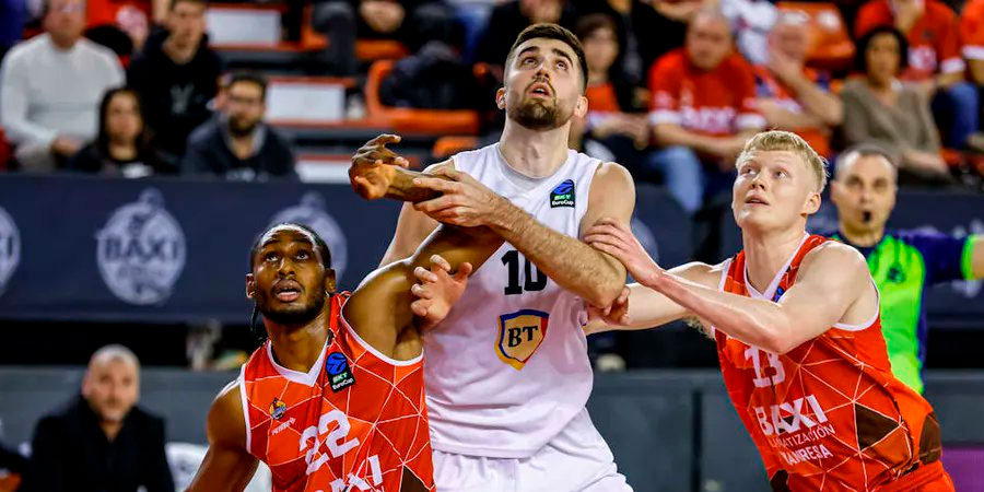 Enfrentamiento de baloncesto entre Besiktas y JL Bourg en la Eurocopa, Conjunto B, el 22/04/2026. Besiktas está en la situación 1 de la tabla con un porcentaje de victorias del 72%. Han ganado 13 partidos y perdido 5, con un promedio de puntos en pos de 92.56 por partido y en contra de 8272.